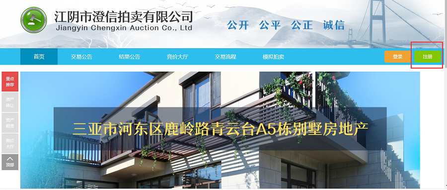 1、用户注册进入江阴市澄信拍卖有限公司交易系统(http://www.jyscxpm.com/),点击“注册”或“免费注册”(图1-1)。