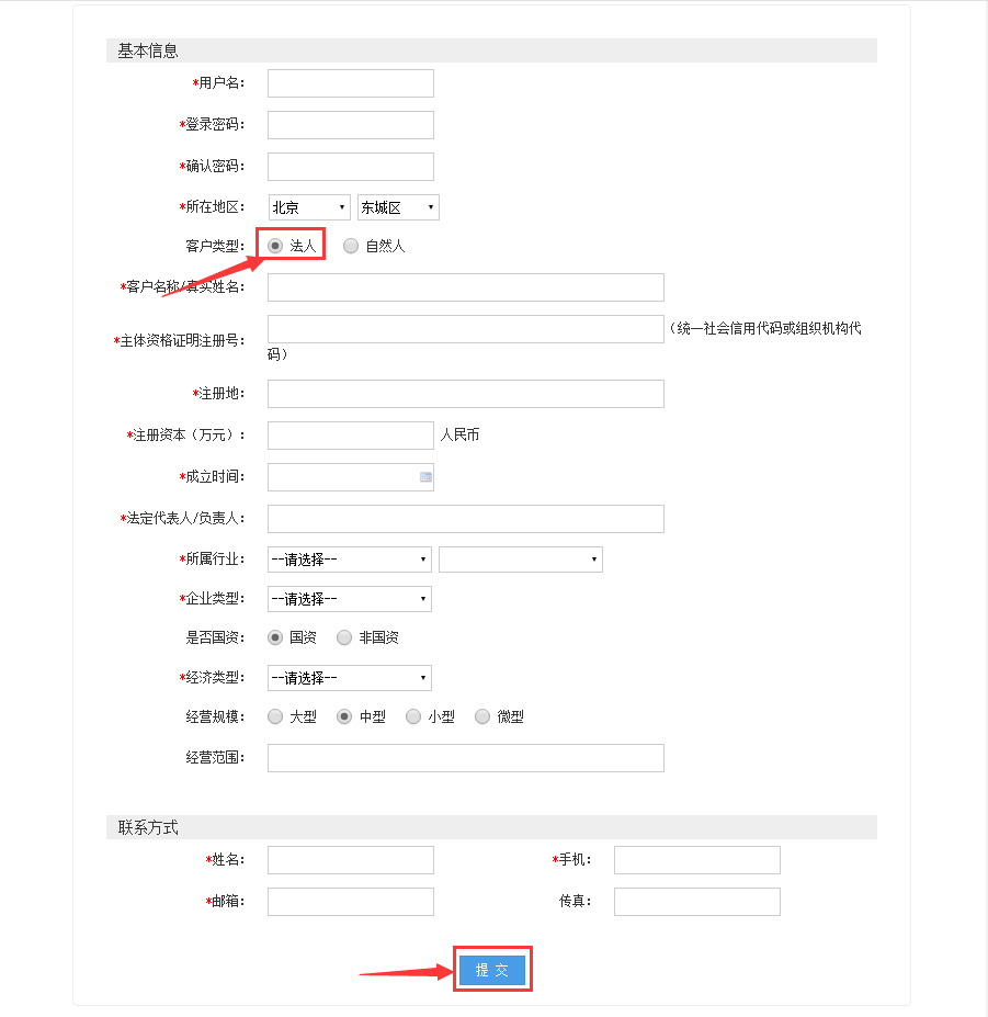 选择客户类型为“法人”,请按要求(图1-2)如实填写注册信息,信息填写完成后点击提交,即可完成注册。