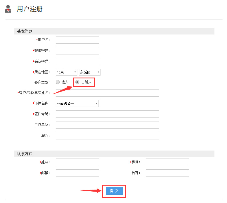 选择客户类型为“自然人”,请按要求(图1-3)如实填写注册信息,信息填写完成后点击提交,即可完成注册。